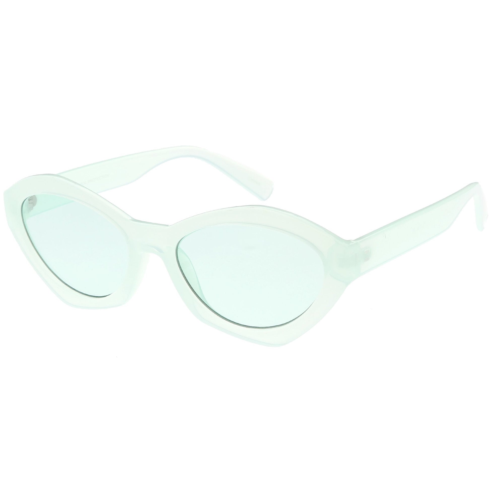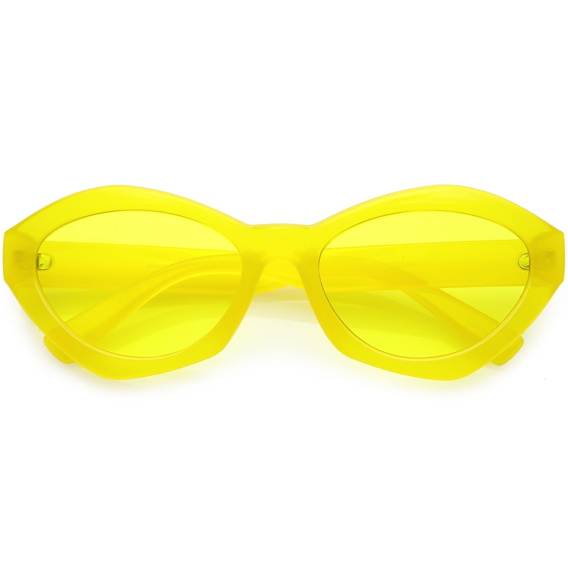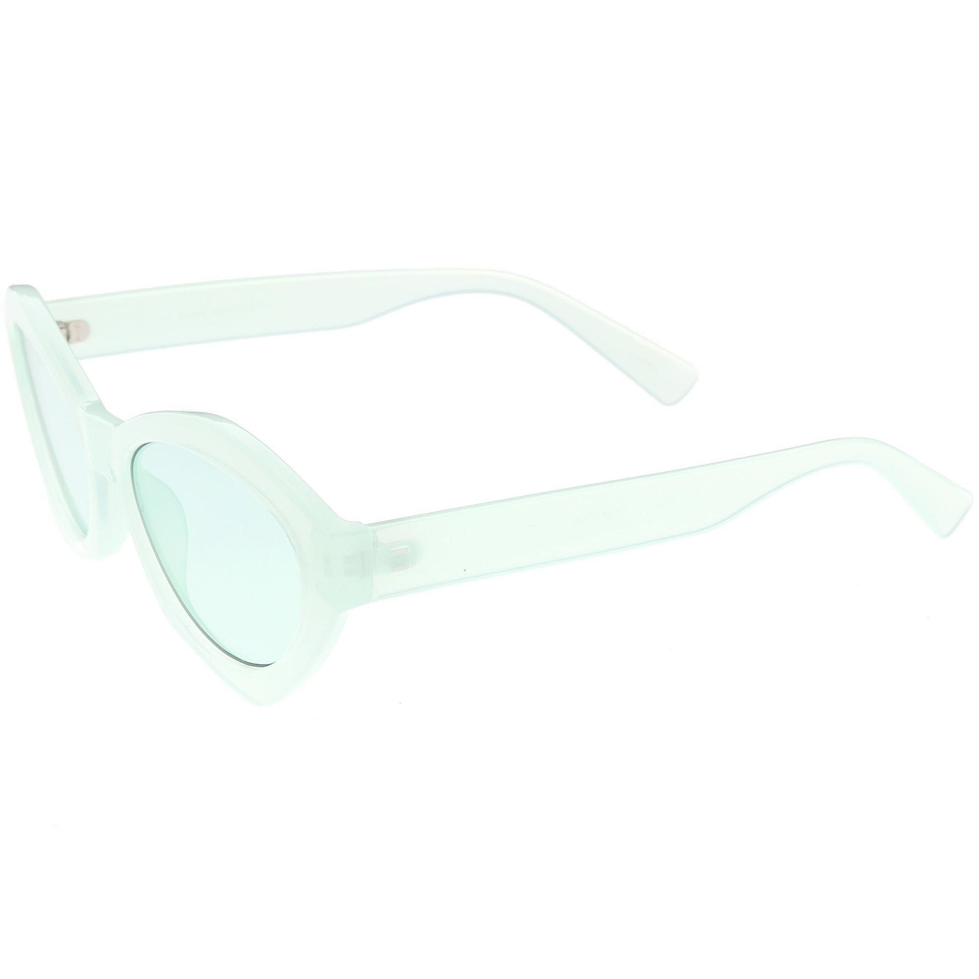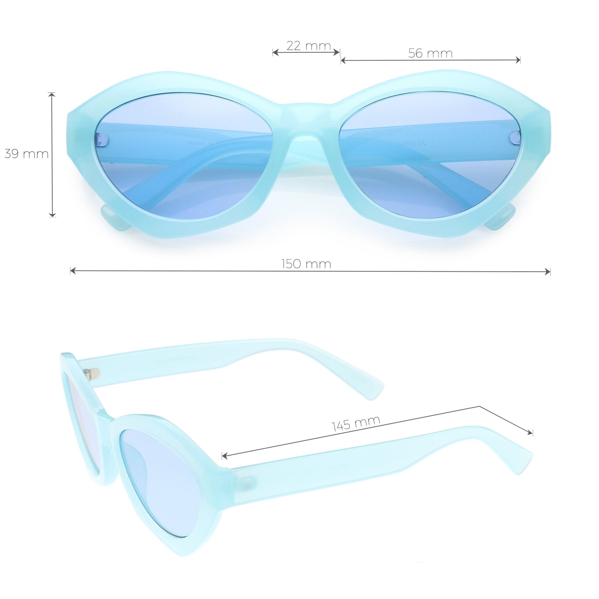 These bold cat eye sunglasses feature a chunky frame and oval flat lenses in mono-colored hues. Accented with high sitting arms for a unique accessory. The edgy frame design provides the perfect mix of modern and retro for a must-have style of this season. Finished with a plastic based frame, reinforced metal hinges, and 100% UV protected lenses.