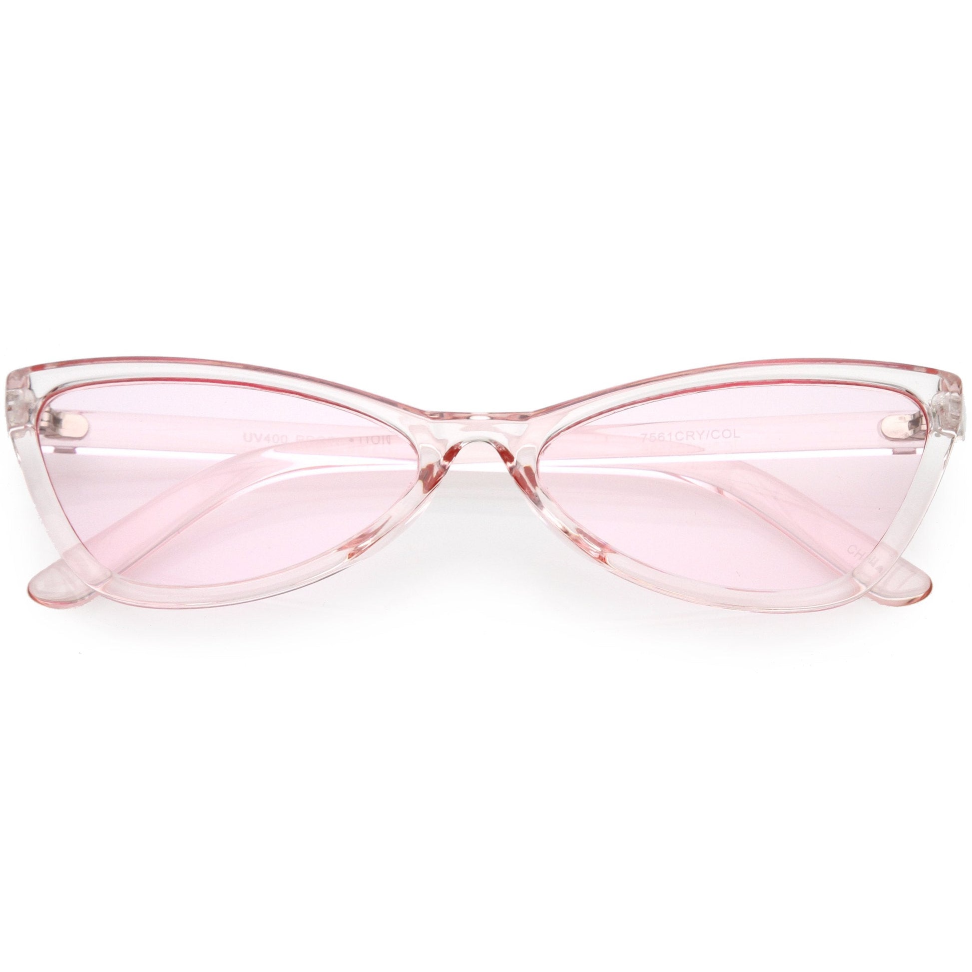 Great for adding a pop of color to your outfit, these retro cat eye sunglasses are designed with a colorful translucent frame and vibrant color tinted lenses. Slim arms complete these monochromatic sunglasses. Style them with your summer looks for a fun and eye-catching look. Made with a plastic based frame, reinforced metal hinges, and 100% UV protected lenses.