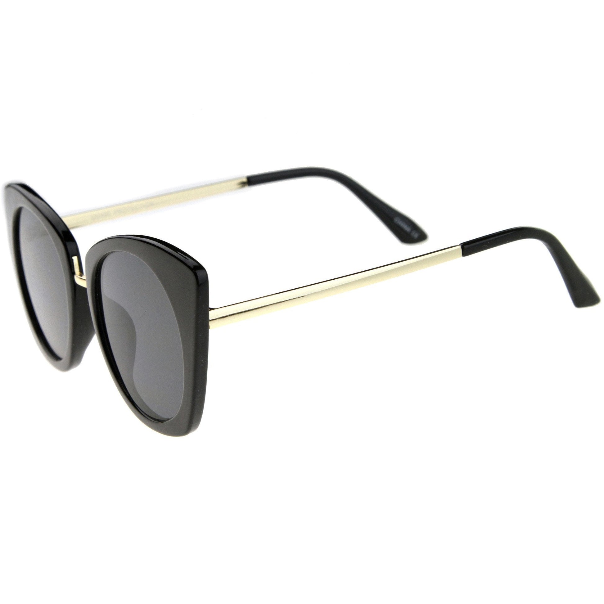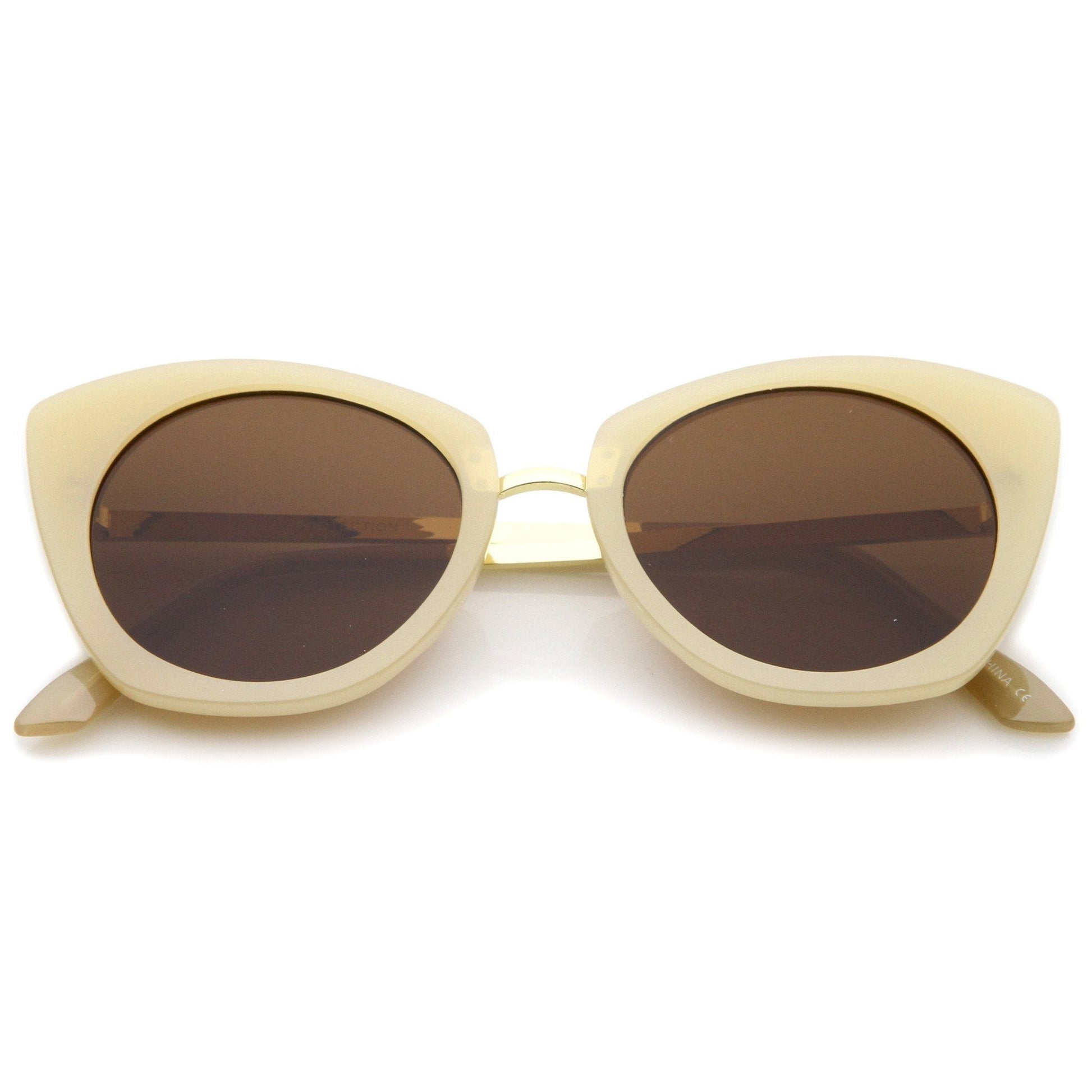 Complement your look with these bold cat eye sunglasses featuring an exaggerated high point silhouette in neutral-colored frames. Round flat lenses give a classic look, while a sleek metal nose bridge and temples add to the style's luxurious feel. Ideal for a day out in the sun, these sophisticated cat eye sunglasses are the perfect combination of elegance and chic. Made with a plastic and metal based frame, metal hinges, and reflective UV400 protected lenses.